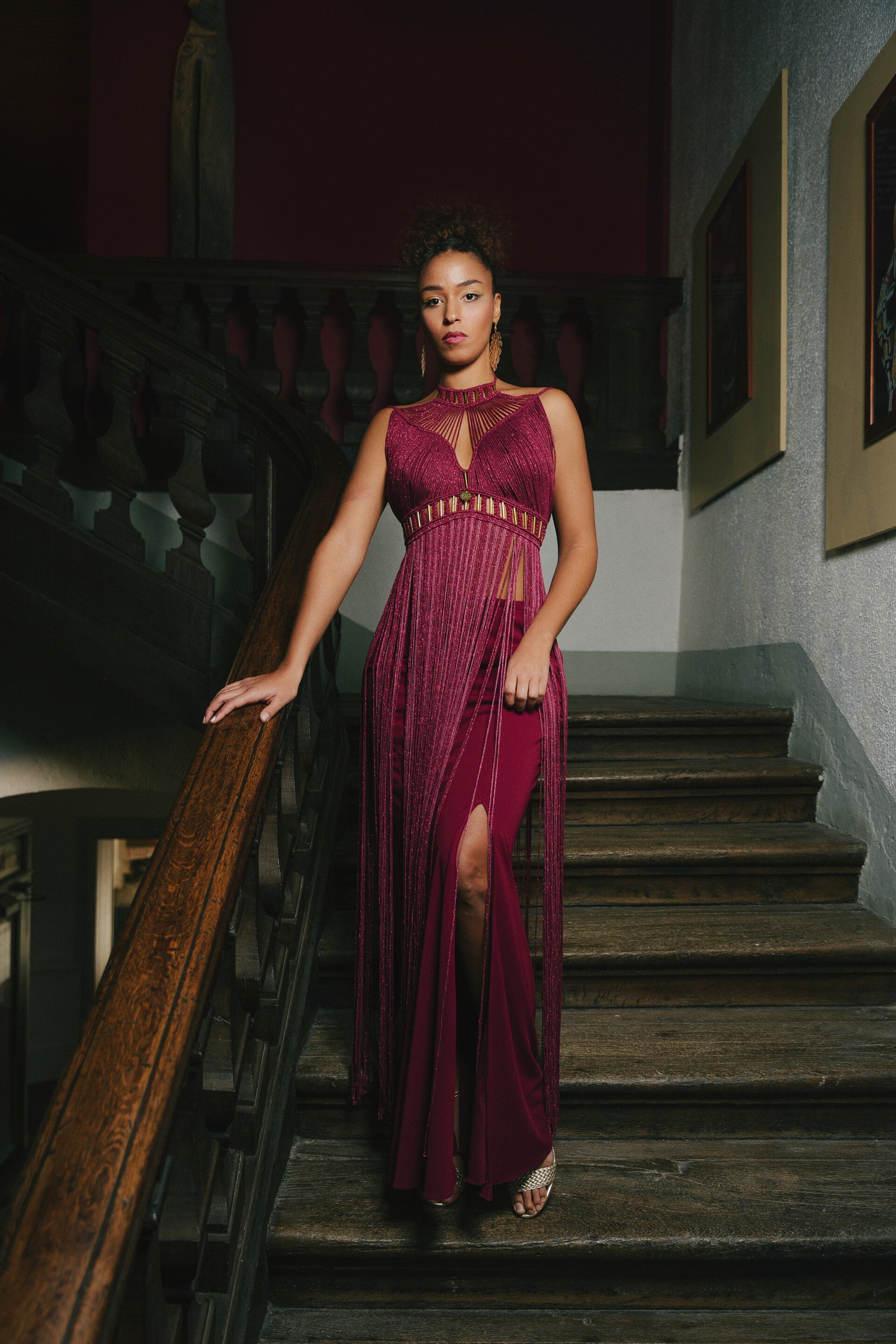 La jupe fendue bordeaux suggérée dans le look peut-être confectionnée à la demande avec un supplément de 200€